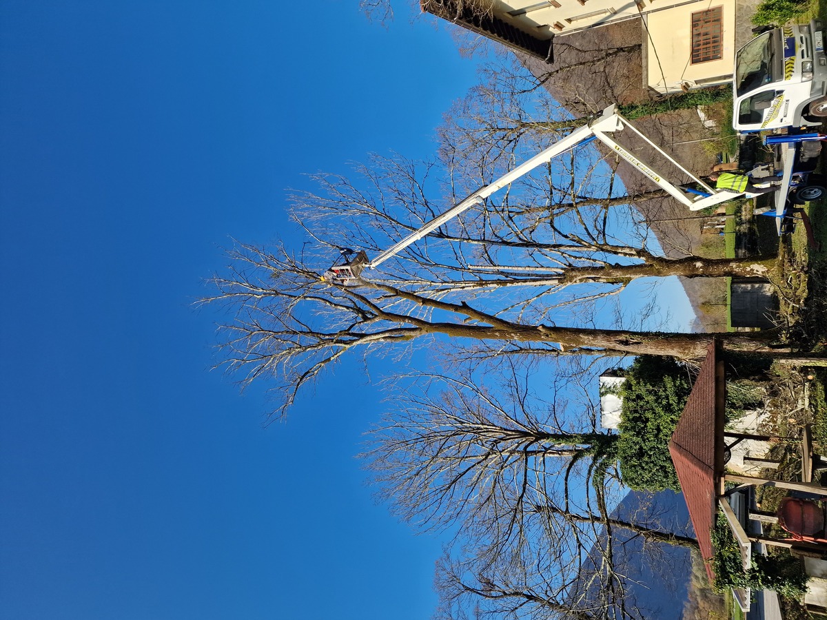 Drevo se je že sušilo, koreninski sistem je bil tudi že načet. Ogrožena je bila varnost človeških življenj in njihovega premoženja. Najbolj ogrožajoče stanje je bilo ob nevihtah z močnejšim vetrom. Odstranitev drevesa je izvedel domači podjetnik s področja strojnega gradbeništva in gozdarstva in s pomočjo dvigala za delo na višini. Odstranitev je bila zahtevna, izvajalec je odstranitev izvedel strokovno in uspešno.