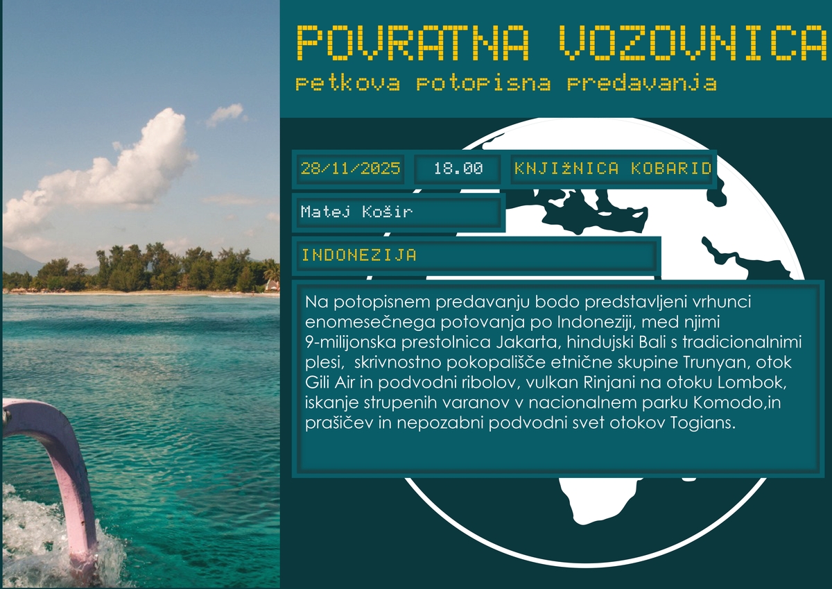 Na potopisnem predavanju bodo predstavljeni vrhunci enomesečnega potovanja po Indoneziji, med njimi 9-milijonska prestolnica Jakarta, hindujski Bali s tradicionalnimi plesi, skrivnostno pokopališče etnične skupine Trunyan, otok Gili Air in podvodni ribolov, vulkan Rinjani na otoku Lombok, iskanje strupenih varanov v nacionalnem parku Komodo,in prašičev in nepozabni podvodni svet otokov Togians.