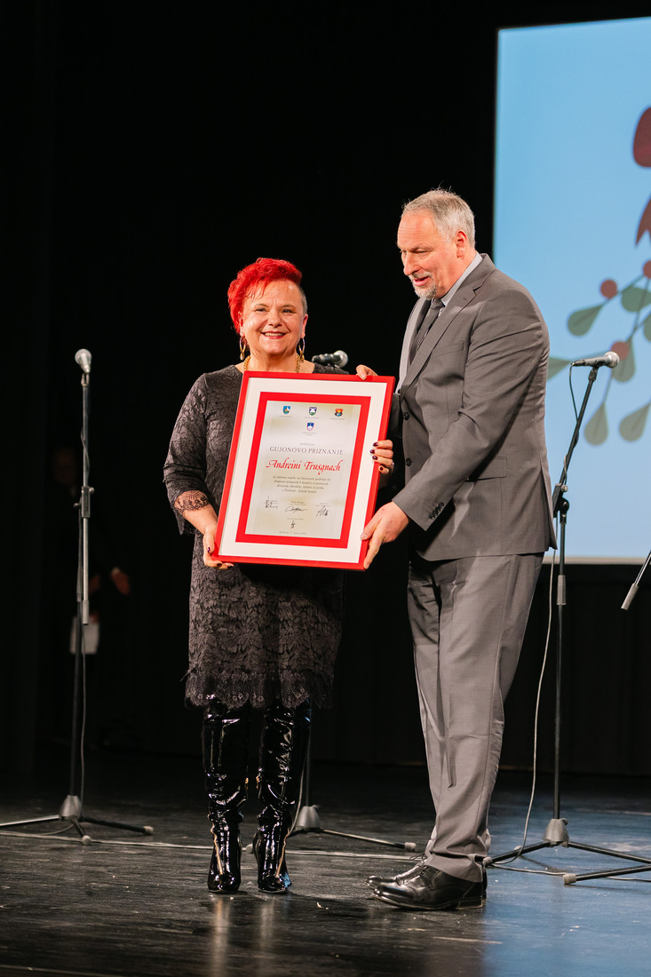 Druga prejemnica Gujonovega priznanja pa je bila Andreina Trusgnach, ki ga je prejela za izjemne literarne dosežke ter dragocen in vztrajen prispevek k ohranjanju in uveljavljanju slovenskega jezika in kulture v Benečiji. Njeno ustvarjanje v slovenskem beneškem narečju predstavlja zavesten in pogumen odgovor na postopno izginjanje jezikovne raznolikosti v Videnski pokrajini. Njena poezija, proza in besedila popevk so bila večkrat nagrajena ter objavljena v številnih publikacijah v Sloveniji in Italiji, s čimer pomembno prispevajo k prepoznavnosti beneških Slovencev v širšem prostoru.