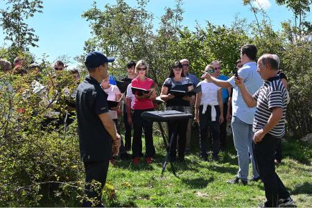 Na planini Kuhinja se je zbralo preko 250 ljudi, ki so prisostvovali kulturnemu programu, ki so ga sooblikovali mešani pevski zbori Posočja, učenci Podružnične šole Smast, harmonikaš Glasbene šole Tolmin in recitator. Vabilu se je odzval tudi pater Bogdan Knavs iz bazilike na Sveti gori, ki je spregovoril nekaj besed o pomenu spominjanja vseh mrtvih in ploščo blagoslovil. Zbrane je pozdravil in nagovoril tudi kobariški župan Marko Matajurc, člani društva Peski pa so ob tej priložnosti dr. Vasji Klavora podelili častno članstvo v društvu.